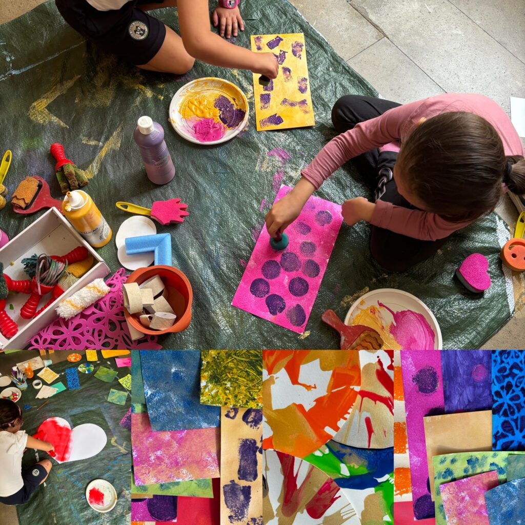 Spugne, rulli, tamponi e tanto altro: la sorpresa di vedere che tipo di segno lascerà lo strumento scelto sulla carta, il coraggio di mescolare due colori insieme per creare “il mio colore“, inventare nuovi pattern, sono attività che producono nel bambino eccitazione e entusiasmo, incoraggiando la libera espressione.