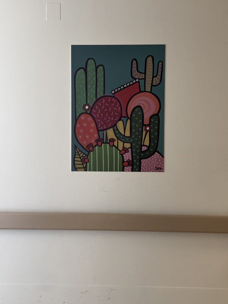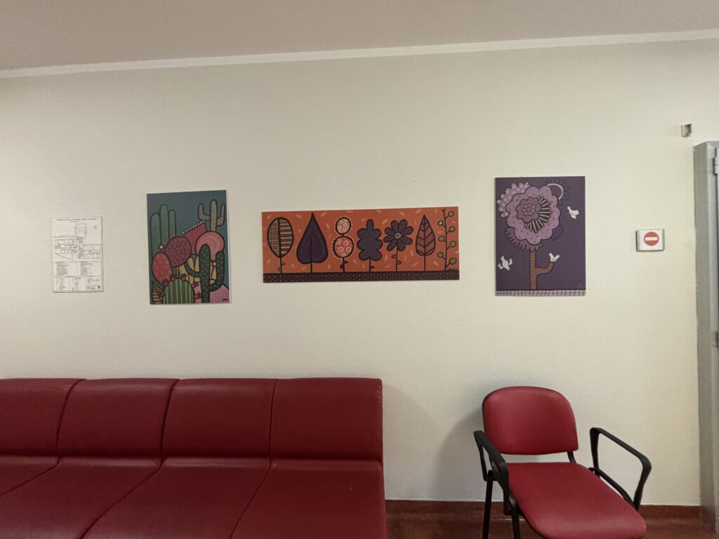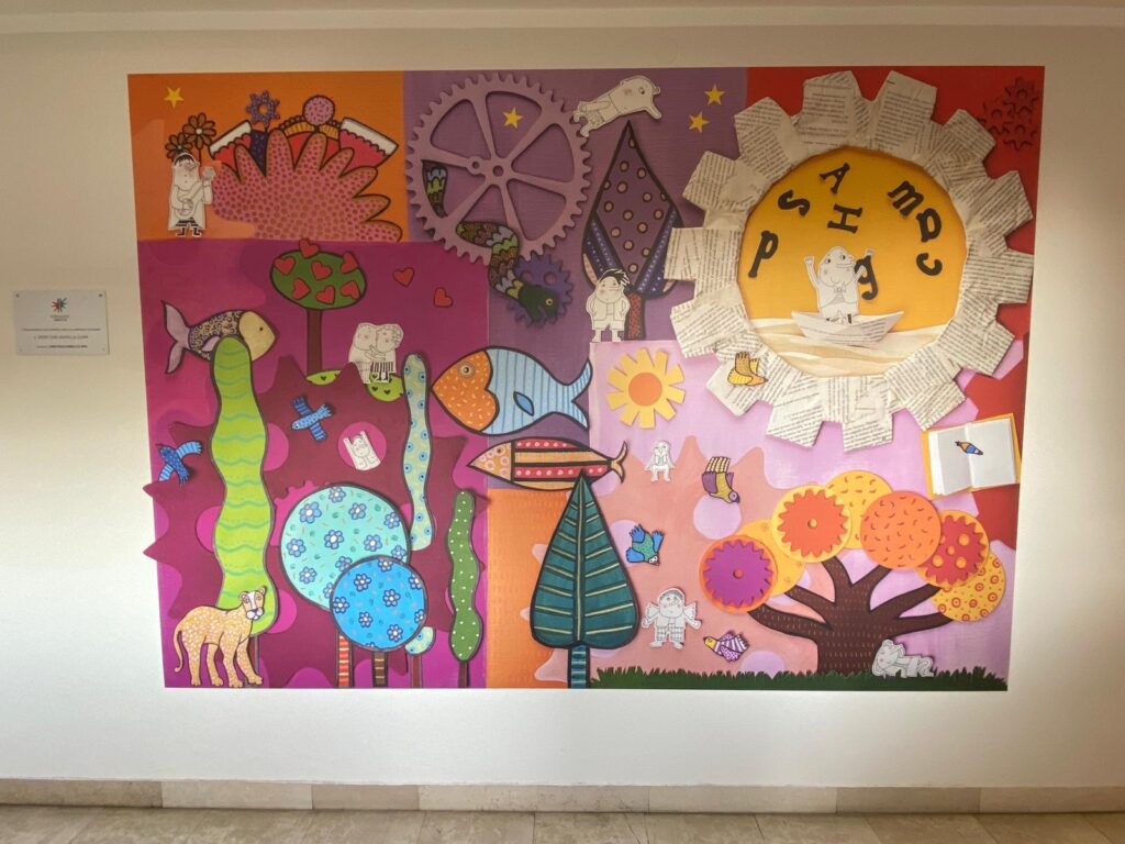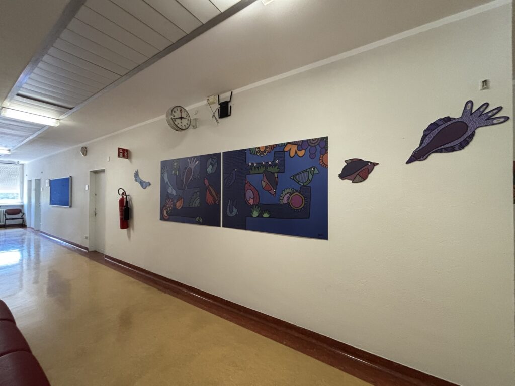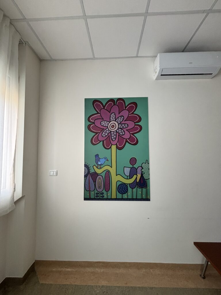 capaci di evocare paesaggi lontani, liberi e luminosi. Ogni elemento è rappresentato con linee morbide e colori intensi, come in un sogno ad occhi aperti, per stimolare l’immaginazione e invitare l’osservatore a distaccarsi, anche solo per un attimo, dalla dimensione ospedaliera.